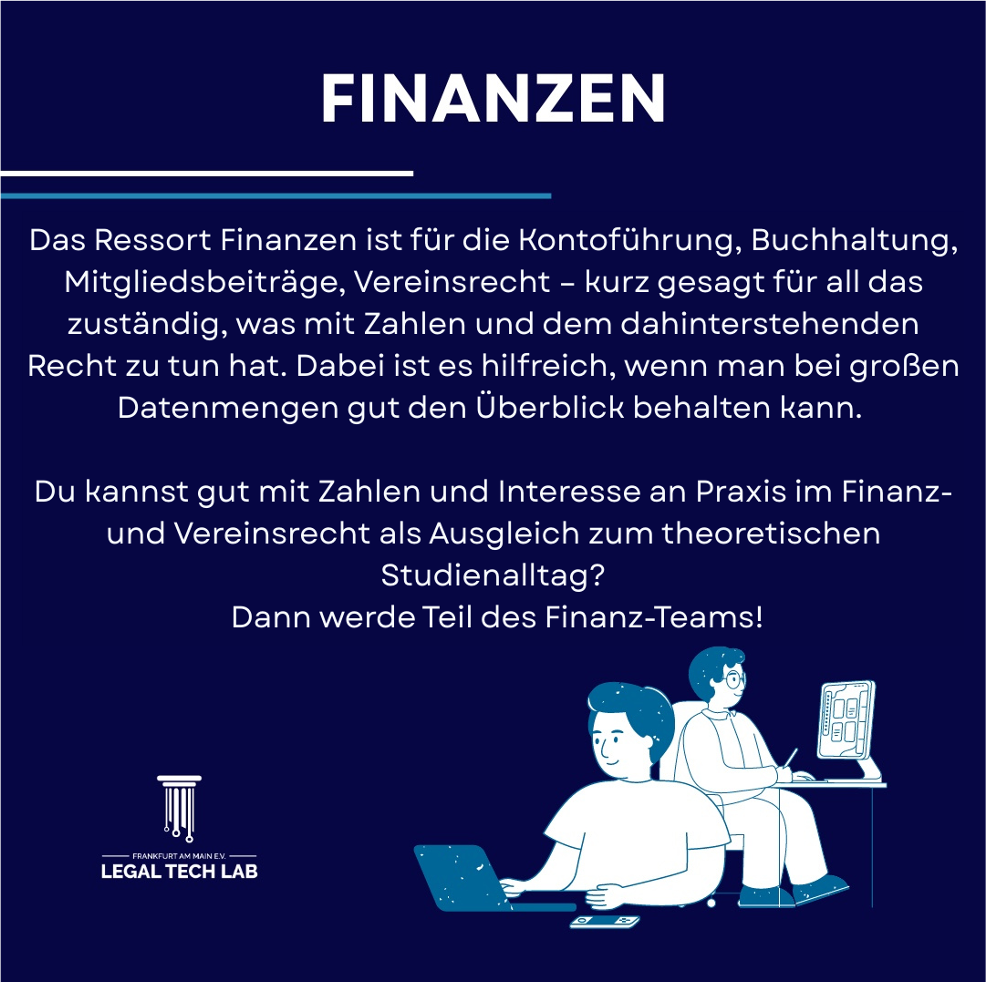 Unser Finanz – Ressort wird zurzeit von Leon Mušan, Sebyom Lee und Felix Zickler betreut. Hierbei lassen sich die Kontoführung, Buchhaltung, Budgetierung sowie der Einzug der Mitgliedsbeiträge als Hauptaufgaben des Finanz – Ressort zusammenfassen. Doch auch die Recherche zu jeglichen steuer- sowie vereinsrechtlichen Fragen und ebenso die Verwaltung unserer Mitgliederdatenbank gehört zum Ressort – Alltag.